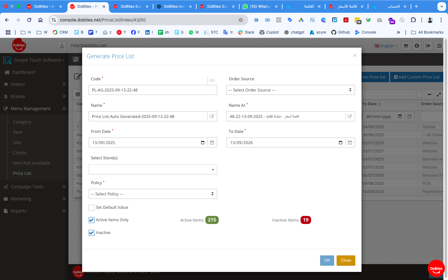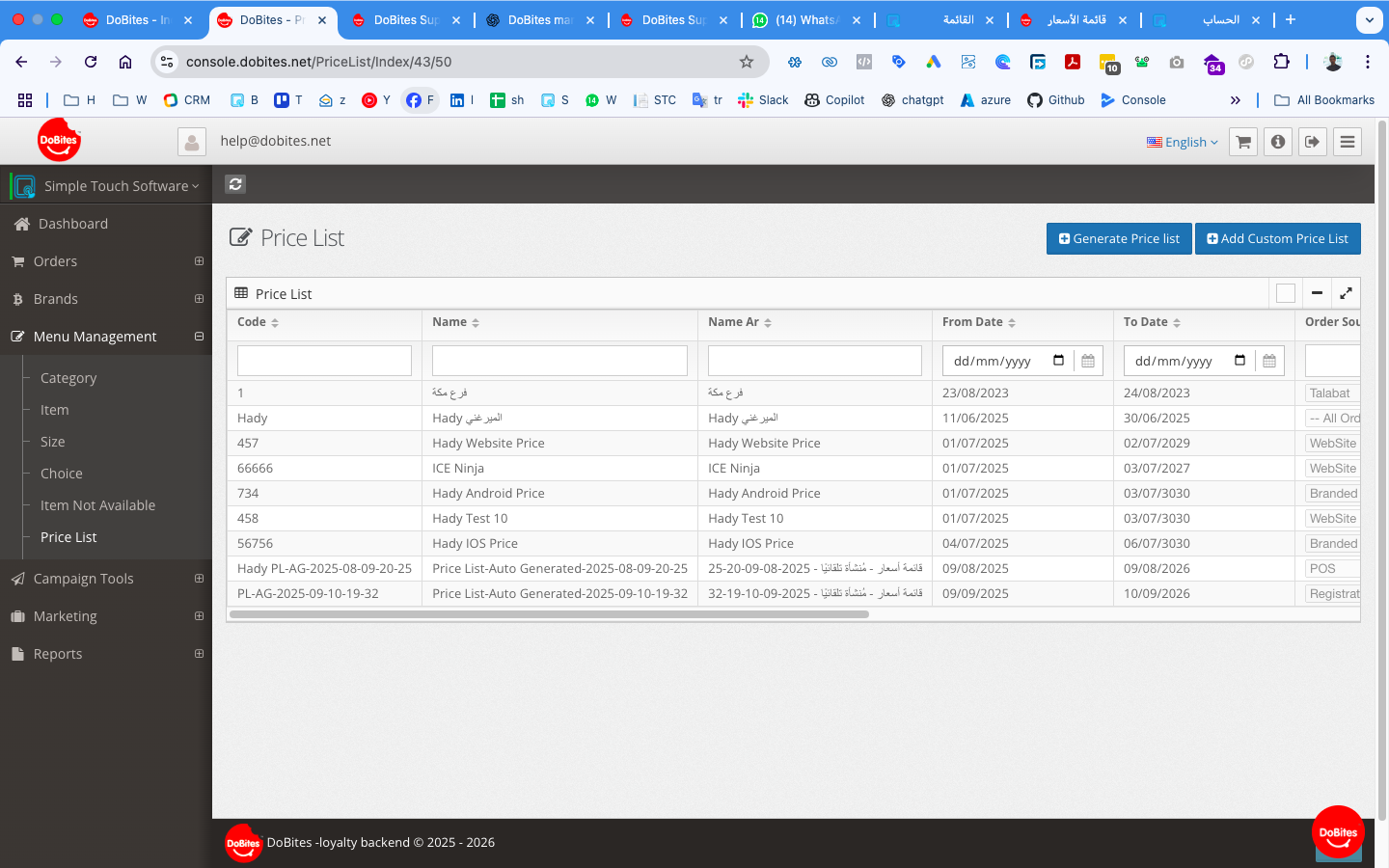 Code*: كود داخلي يتم توليده تلقائيًا لتعريف قائمة الأسعار بشكل فريد.
