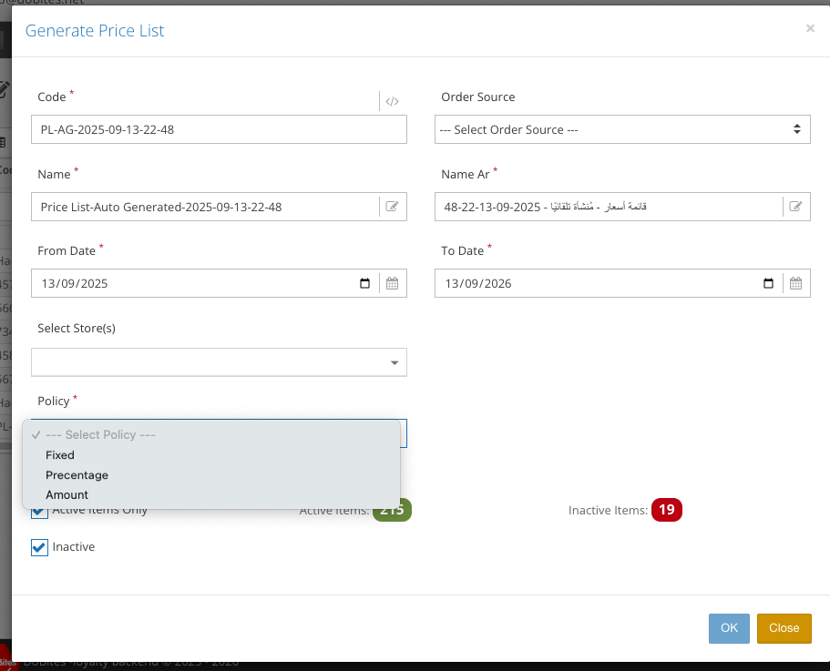 Policy*: تحديد سياسة التسعير (Pricing Policy) المرتبطة بالقائمة.